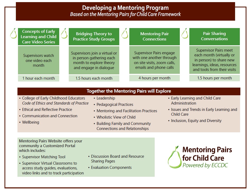 Mentoring Pairs for Child Care (MPCC) is a year-long hybrid professional learning and mentoring strategy designed to pair more experienced child care supervisors with less experienced child care supervisors. Together, the mentoring pair will participate in the program, which has the following four components.